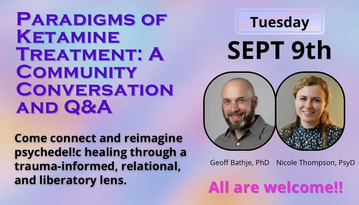If these questions stir something in you, we invite you to join Geoff Bathje and Nicole Thompson for a virtual community conversation on Tuesday, September 9th from 5:00 - 6:00pm. We will explore the evolving paradigms of ketamine treatment and why Sana’s relational, community-centered model offers something unique.