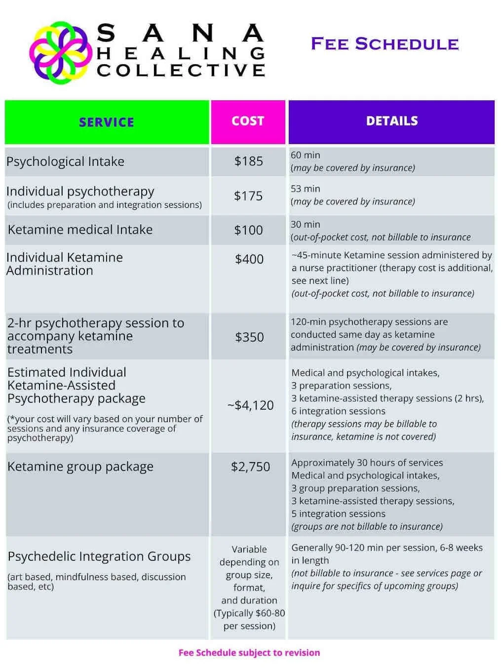 The cost of our Ketamine-Assisted Therapy services will vary based on needs and one’s individual treatment plan. Our Fee Schedule to the left outlines the potential out-of-pocket costs for all of our services.